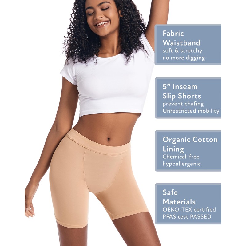 - Enjoy unparalleled comfort and coverage with our Anti-Chafing Hi-Rise period underwear in a 5-inch inseam slip shorts style. Say goodbye to irritation as it features a fabric waistband and no side seams for a seamless and irritation-free experience. Move freely and feel confident knowing you have full front-to-rear coverage while staying protected against chafing.