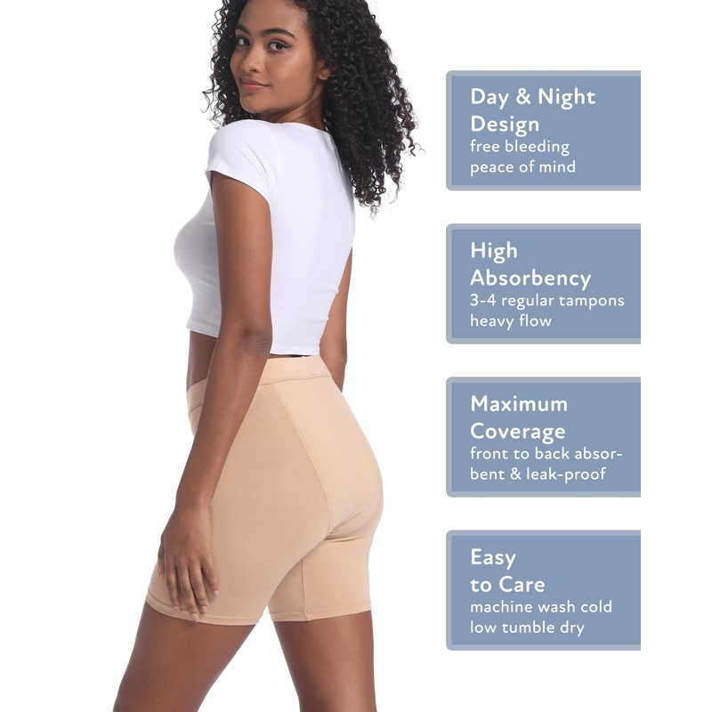 - Seeking usage and care tips? Our 5-inch period shorts underwear is perfect for medium to heavy flow, equivalent to the absorbency of 3 to 4 tampons. Its versatile design caters to day, night, postpartum, and light incontinence needs. Cleaning is a breeze: simply rinse, machine-wash cold, and hang dry or tumble dry on extra-low. Avoid high-temperature dryers, bleach, and fabric softener to maintain the longevity of your underwear.