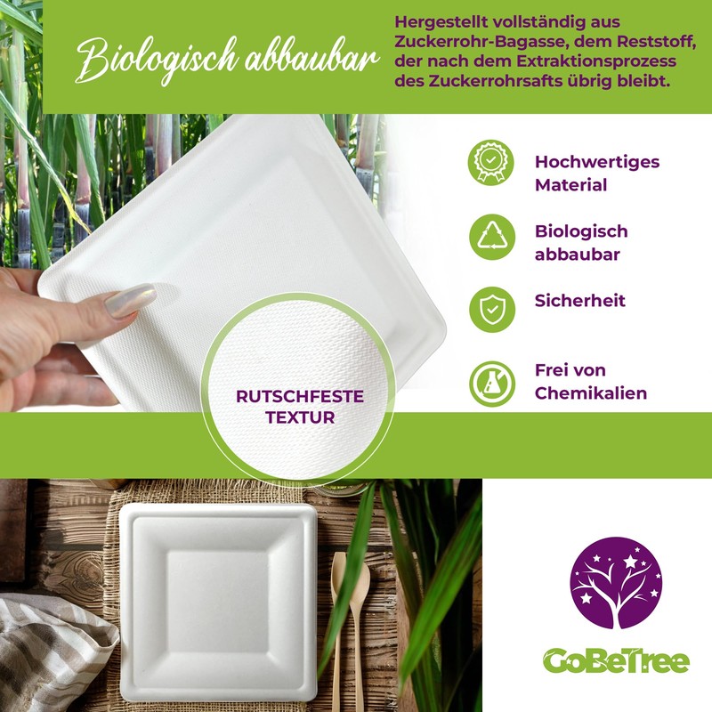 - Biodegradable: our disposable plates are made from 100% sugarcane fibres, a sustainable, renewable and biodegradable material. It is an excellent alternative to traditional paper or plastic. When used up, they can be disposed of in organic waste.