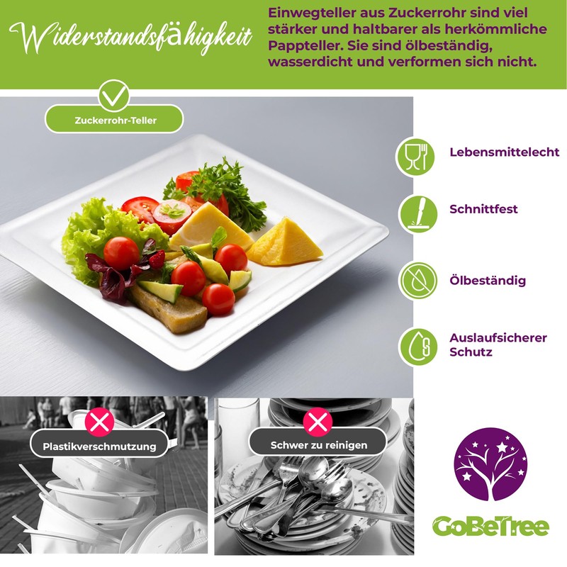- Durability: disposable sugar cane plates are much more robust and resistant than traditional paper plates. The material is grease-resistant, water-repellent and does not warp.