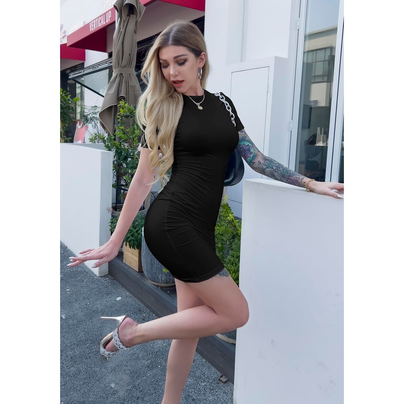 - O neck,short sleeve,midi-length,solid color,tight,bodycon,classic.You can match necklace and belt,also,you can dress up with cool jacket and coat