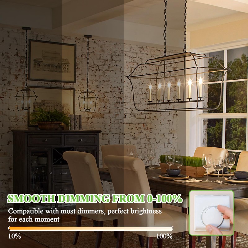 - Smooth Dimming for Every Mood10%-100% Flicker-Free ControlOur E12 LED bulb is compatible with 90%+ modern LED dimmers, allowing you to seamlessly adjust brightness from a soft ambient glow (10%) to a full 630-lumen brilliance (100%)ideal for movie nights, romantic dinners, or focused work sessions. These dimmable LED light bulbs have no flickering, no buzzing, just silky-smooth transitions and perfectly integrate with your smart home system!
