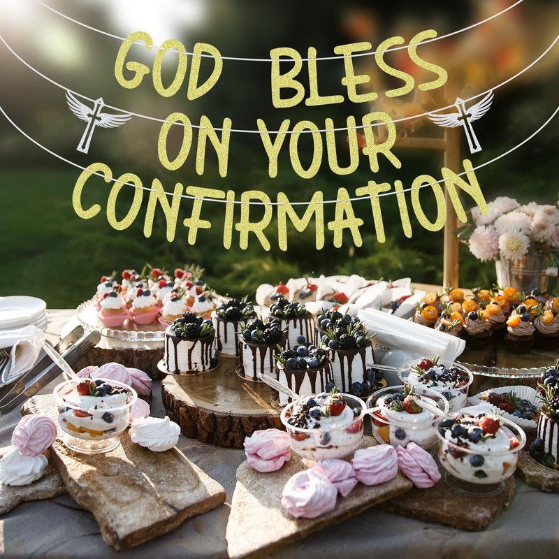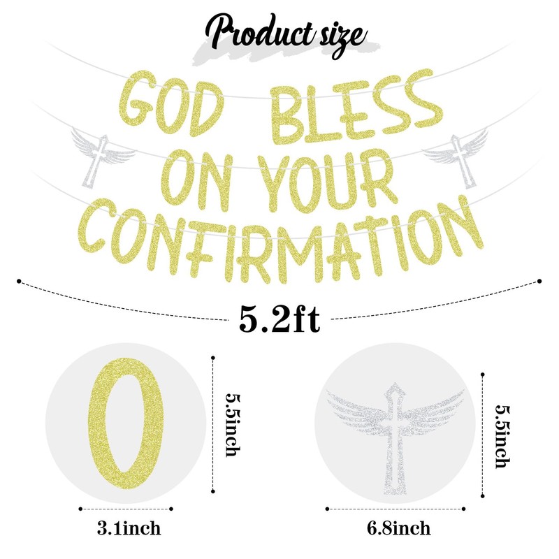 God Bless On Your Confirmation Banner, Blessing Confirmation, First Communion, Baptism/Christening/Baby Shower Party Decorations Gold Glitter