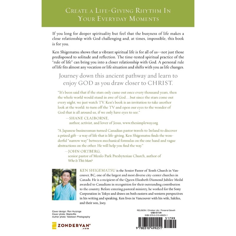 Ken Shigematsu shows that spiritual formation is more than just solitude and contemplative reflections. Spiritual formation happens in the everyday, in each and every moment of life. For those caught up in the busyness of work, family, and church, it often feels like time with God is just another thing on a crowded “to-do’ list. Ken explains how the time-tested spiritual practice of the “rule of life” can help bring busy people into a closer relationship with God. He shows how a personal rule of life can fit almost any vocation or life situation.