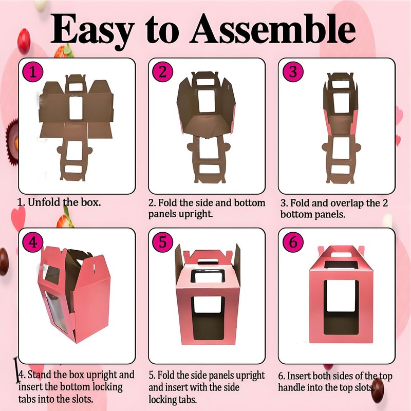 • Easy to Assemble - Convenient Carry HandleThe item is flat and pre folded, the cake box is flat and easy to assemble and disassemble. When not in use, you just need to unfold and flatten it, which significantly saves storage space and makes storage extremely convenient. For the tall cake box, you can refer to the 5th picture for detailed assembly steps. Additionally, its top is thoughtfully equipped with a handle, offering great convenience for carrying when going out.