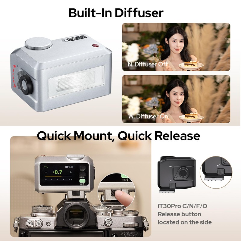 • 【Built-In Diffuser】With a quick flick of the lever, the iT30 Pro’s built-in diffuser drops into place to deliver wider coverage and beautifully soft, even lighting—flattering every skin tone without the need for extra modifiers.Quick Mount, Quick Release,Redesigned quick-release foot lets you lock or remove the flash in a single press—speeding up your workflow on every shoot.