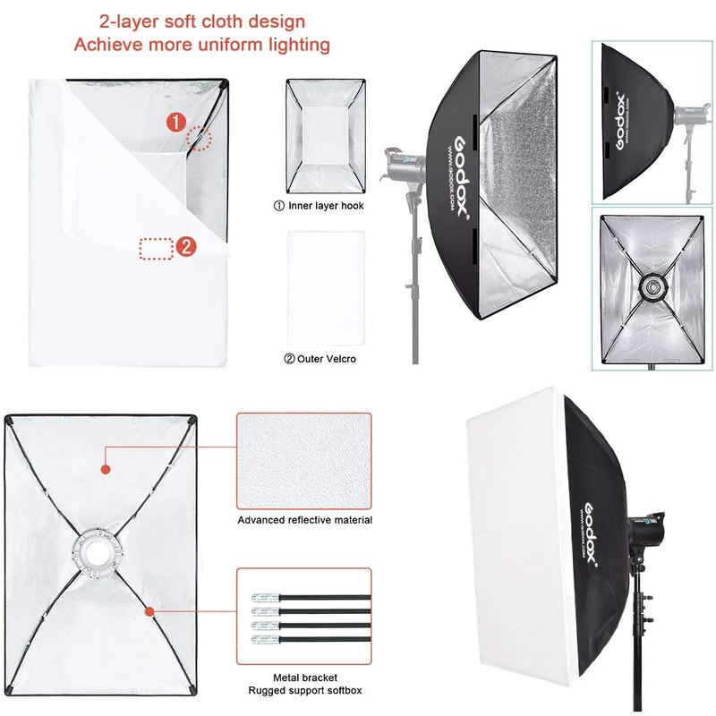 • It is made of a high-density, highly reflective material. With a double metal frame, the softbox is both lightweight and solid.