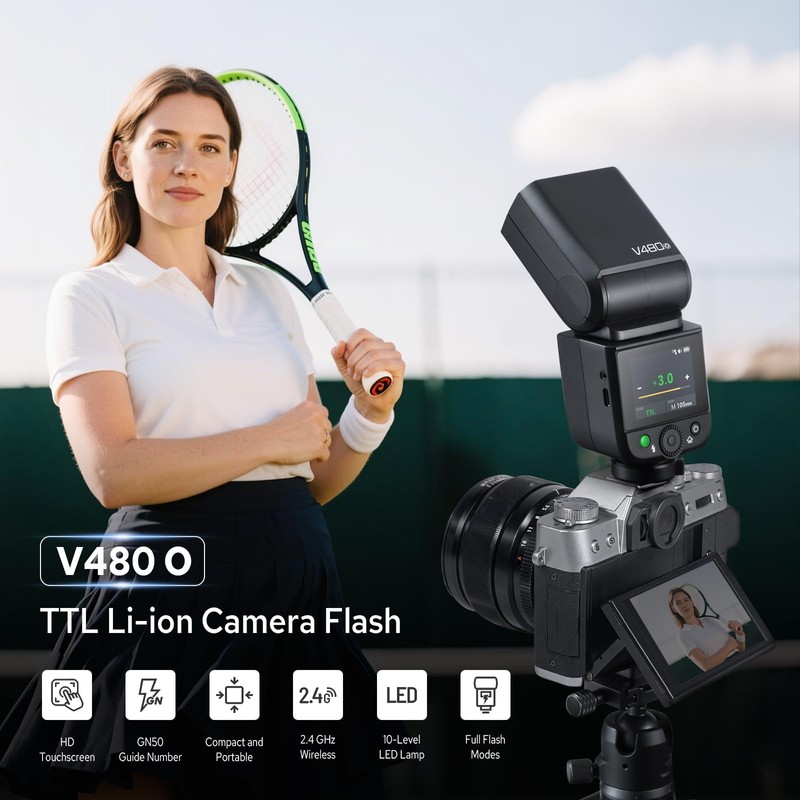 - 650 Full-Power Flashes : Godox V480O Flash Speedlite with a 7.2 V/2200 mAh rechargeable battery delivers up to 650 full-power flashes and recycles in just 1.7 s. USB-C charging lets you top up between sessions so you can keep shooting all day