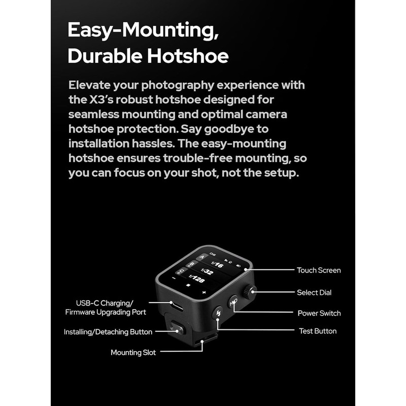 - Easy-Mounting, Durable Hotshoe: Redefine your shooting experience with the GODOX X3L FLASH TRIGGER's robust, easy-to-mount hotshoe. Designed for ultimate convenience and protection.