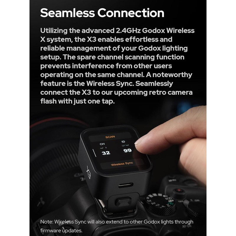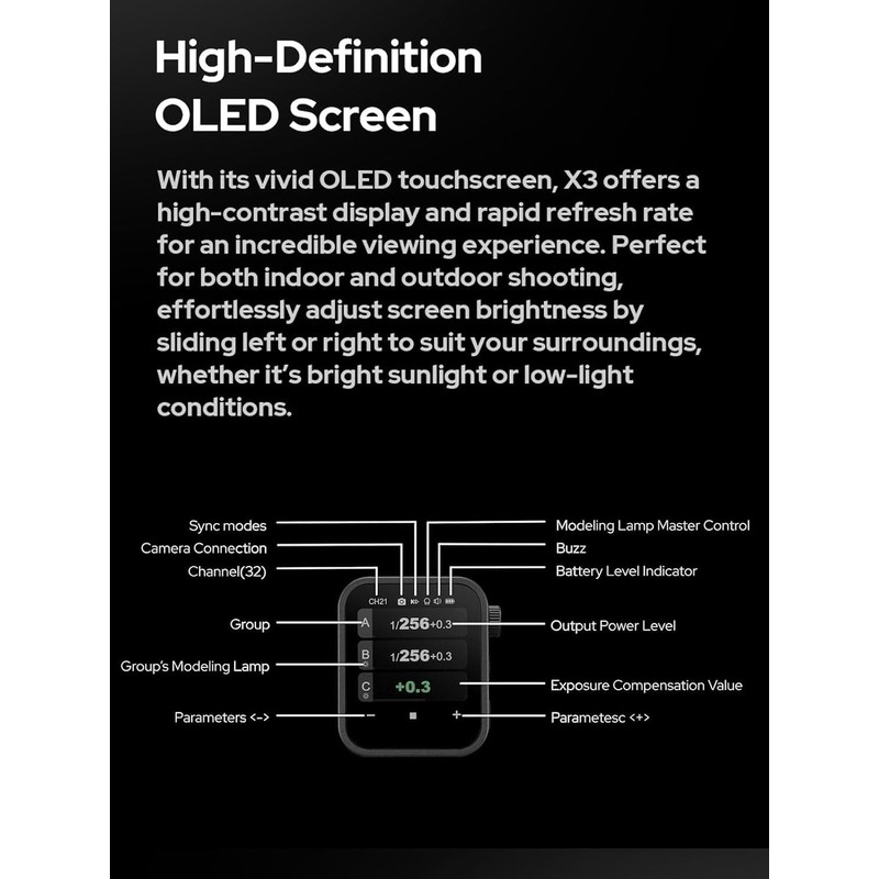 - High-Definition OLED Screen: Experience unparalleled clarity with the GODOX X3L FLASH TRIGGER's state-of-the-art OLED touchscreen. Engineered for an immersive viewing experience, its high-contrast display ensures vibrant visuals and swift refresh rates.