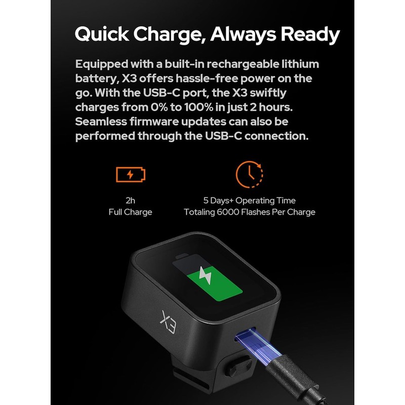 - Quick Charge, Always Ready: Never miss a shot with the GODOX X3L FLASH TRIGGER's fast-charging, built-in lithium battery. Charge efficiently via the USB-C port, rocketing from 0% to full charge in just two hours.