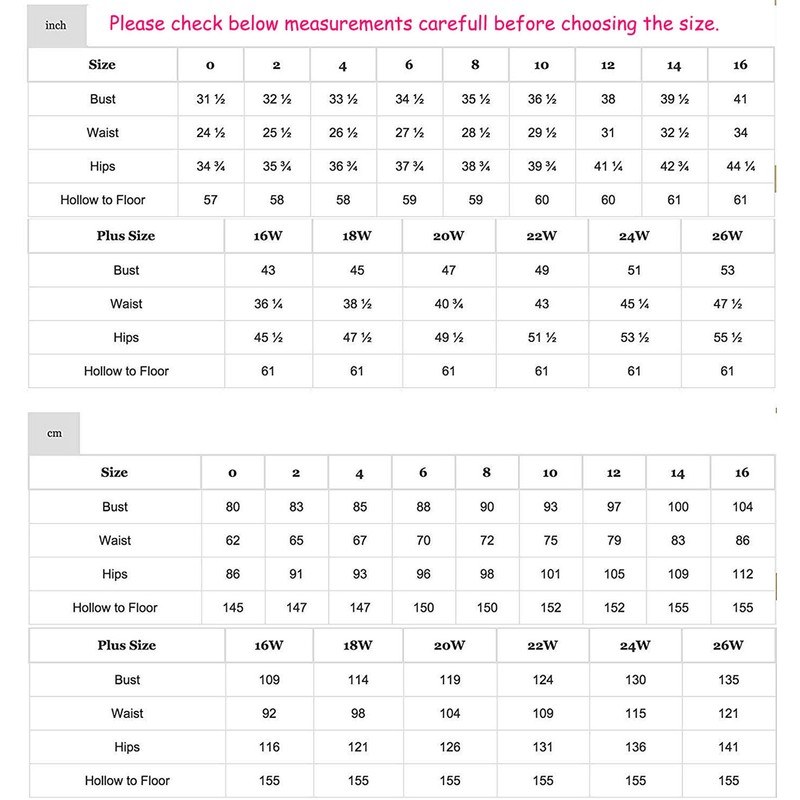 - How to Choose Size: Please refer to Our Size Chart Picture which follows dress images. If you want the dress to be customized, choose the size closest to your own size and send the measurements of bust, waist, hips, hollow to floor, height and heels. No Extra Charge for custom service.