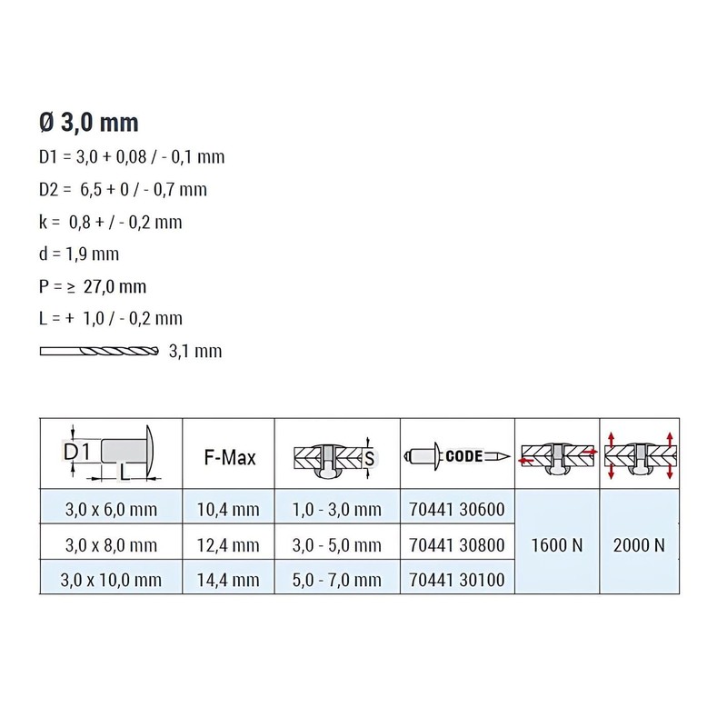 - ☛ ☑ Size ☚ Diameter (mm): 3 ★ Length (mm): 10 ★ Length Rivet Mandrel (P): >= 27.0 mm ★ F-Max (mm): 14.4 ★ Diameter Head (D2): 6.5 + 0 / - 0.7 mm ★ Head Height (K): 0.8 + / - 0.2 mm ★ Rivet mandrel diameter d) (mm): 1.9