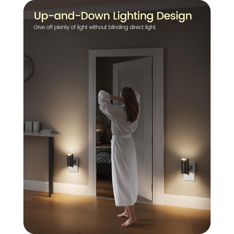 - 3000K Soft Light: Our LED nightlight emits a soft 3000K glow that is not dazzling but bright enough for nighttime illumination. Featuring upward and downward lighting, it avoids direct glare and creates a comfortable atmosphere without disturbing sleep