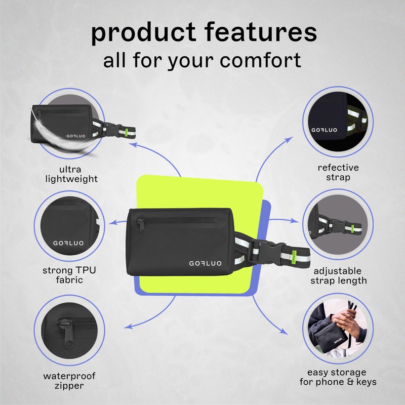 GOFLUO Harper 2.0 Waterproof Waiste Pack Bag - Black Reflective Fanny Pack - Versatile Hip or Shoulder Bag with Reflective-Fluo Strap - Velcro-Free