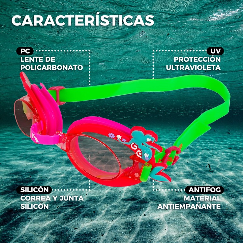 - Visión siempre clara gracias a sus lentes de policarbonato con recubrimiento antivaho, que evitan el empañamiento y garantizan una vista nítida bajo el agua.