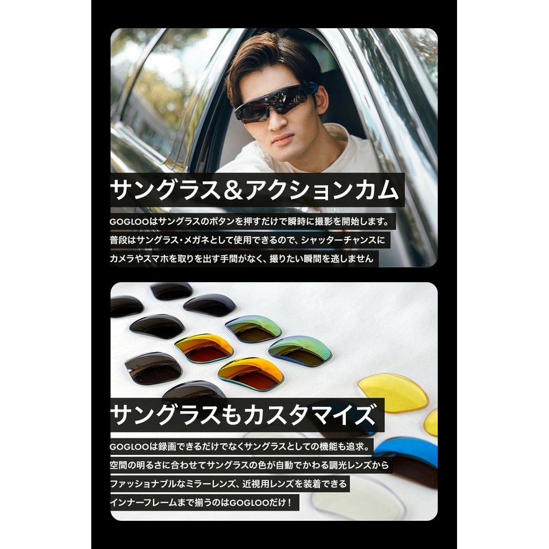 GOGLOO comes with a camera on sunglasses so you don't have to worry about the mounting position or take it out when taking pictures. You can take photos as you see it yourself, and the angle is exactly what you want. You can use it as a sunglass as you normally want, and when you want to take a shot, you can start recording with the single button. You can also take 12 megapixel still images. The built-in battery allows for up to 95 minutes of continuous shooting. You can take photos while charging so you don't miss any time you want to take it.