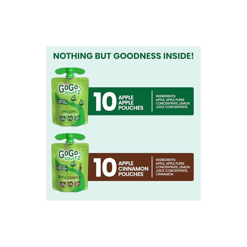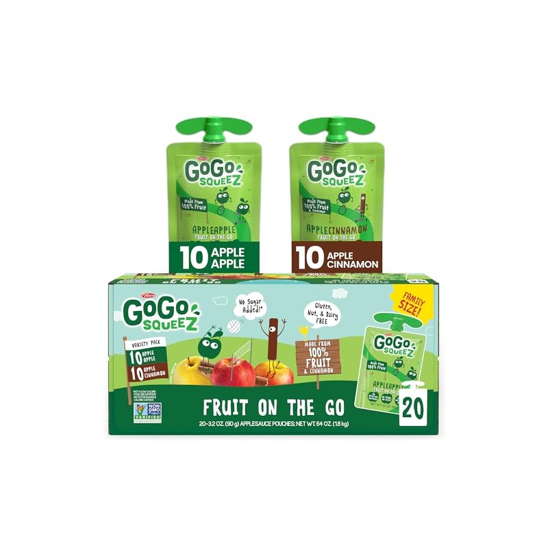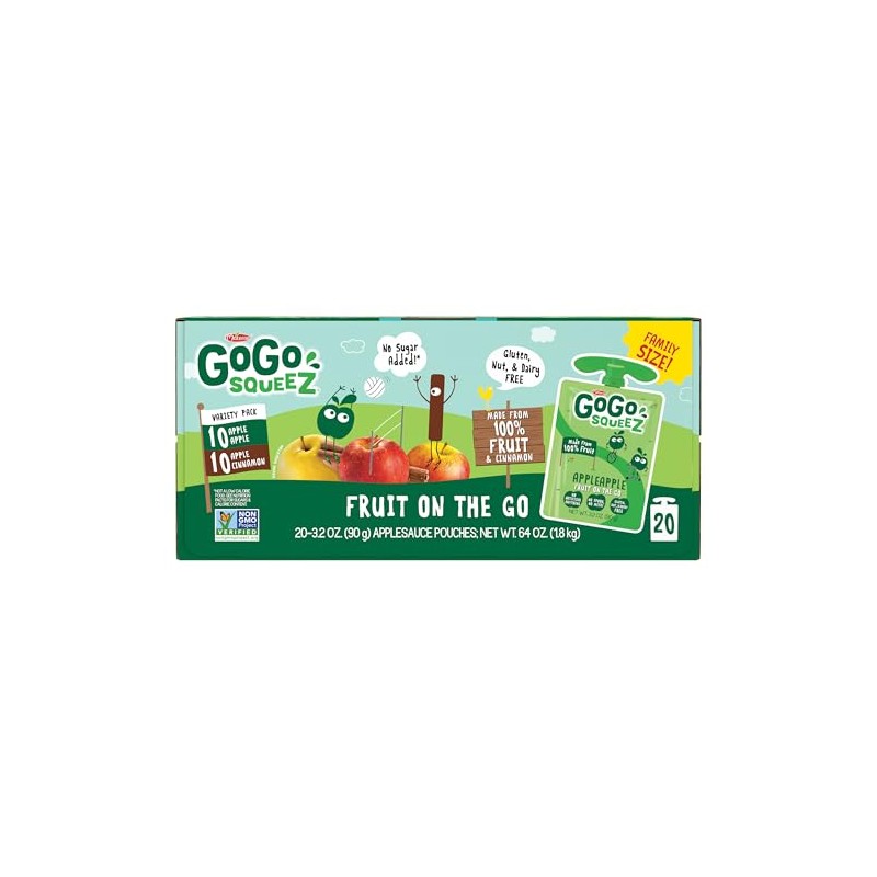 - Stock your pantry or fridge with this pack of 20, 3.2 ounce kid-approved snack pouches (2 flavors to choose from); GoGo squeeZ Fruit on the Go squeeze pouches are kitchen pantry safe (no refrigeration required)
