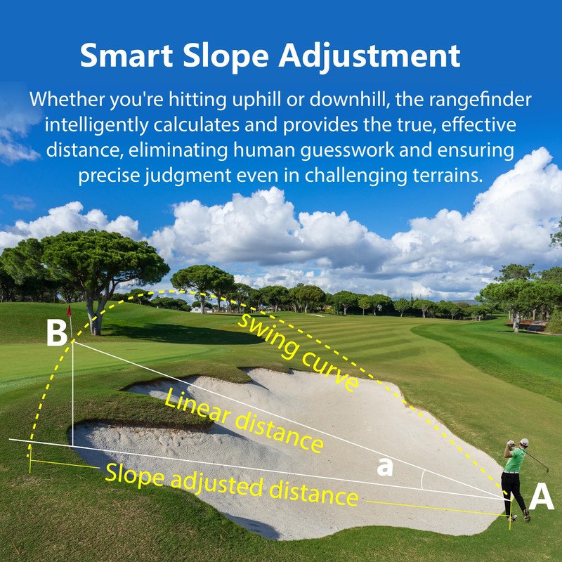 - Slope Compensation & Vertical Distance: In golf mode (M1), the rangefinder will display the slope compensated distance to help you achieve the correct shot distance. In disc golf mode (M2), the range finder will show you the linear distance and the vertical distance, which is calculated based on the angle data provided by this mode.