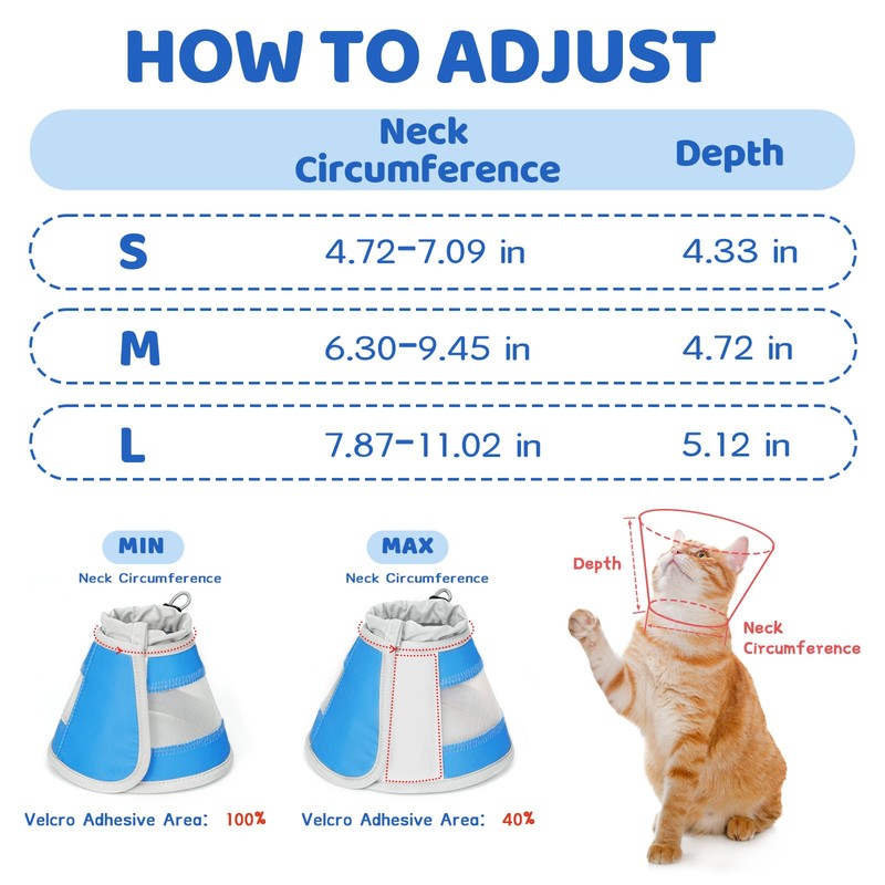 - More Choices: This Elizabethan collar for cats is fashionable and cute, available in multiple colors color options. Sizes suitable for most cats. Please refer to the size chart and measure the size before ordering. Ensure that your lovely cat's neck length is smaller than the depth of the kitten cones after surgery. If the neck size is close to the maximum value, please order the next size up. If you have any questions, please feel free to contact us