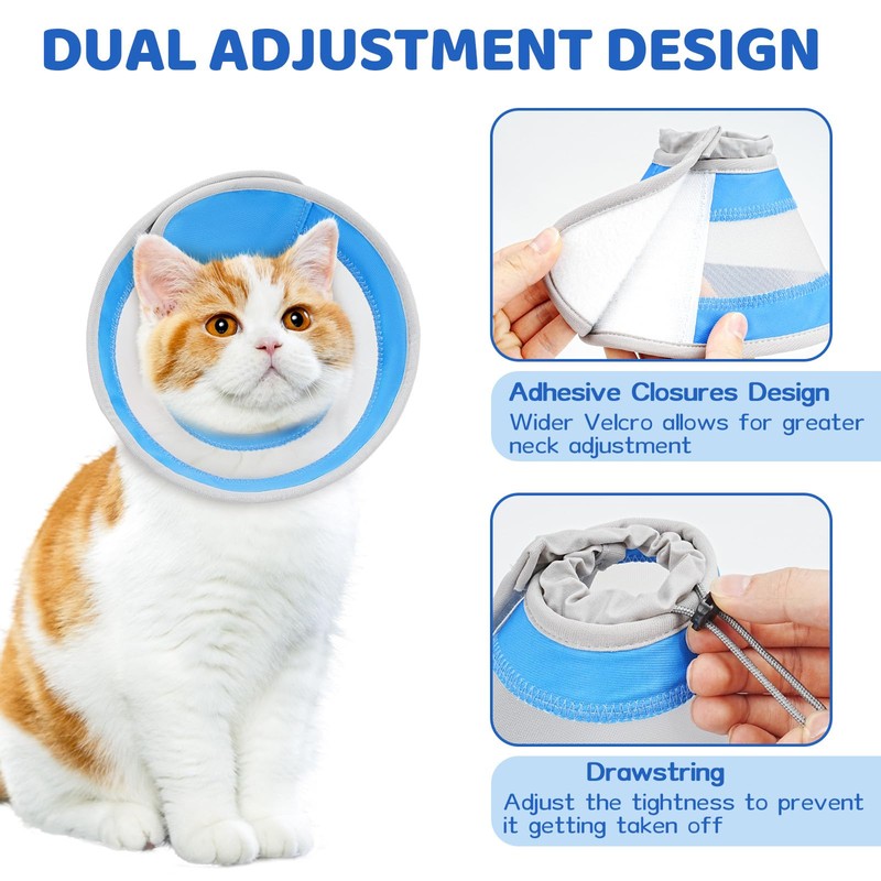 - Adjustable Cone for Cats: Don't worry about the soft cone for cats not fitting or slipping off. We've thoughtfully designed adjustable drawstring and Velcro to perfectly fit your cat. You can effortlessly adjust the tightness to a comfortable position. The buckle can prevent the cat donut collar from falling off and providing optimal comfort and safety. The Velcro design allows put on and take off easily. Warm note: Leave enough breathing space for pets and avoid being too tight