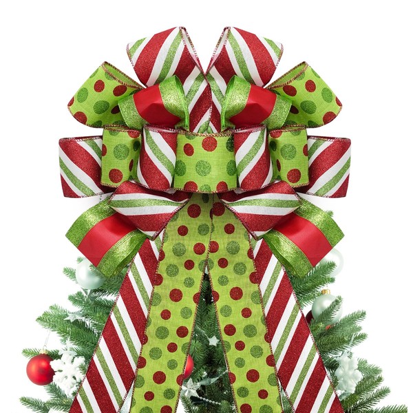 - ❄️Xmas Decorations for Home: Xmas Bow ribbon surface printed with glitter red and green dots which are very shiny.Perfect for spreading holiday spirit and bring good luck to whole family.Those Xmas tree topper make your Christmas tree more beautiful/warm/vivid and makes your home look more Christmas atmosphere,allowing you and your family to spend an unforgettable Christmas.Our large christmas tree bows is the best bow for Christmas tree and will surely bring you and your family a surprise.