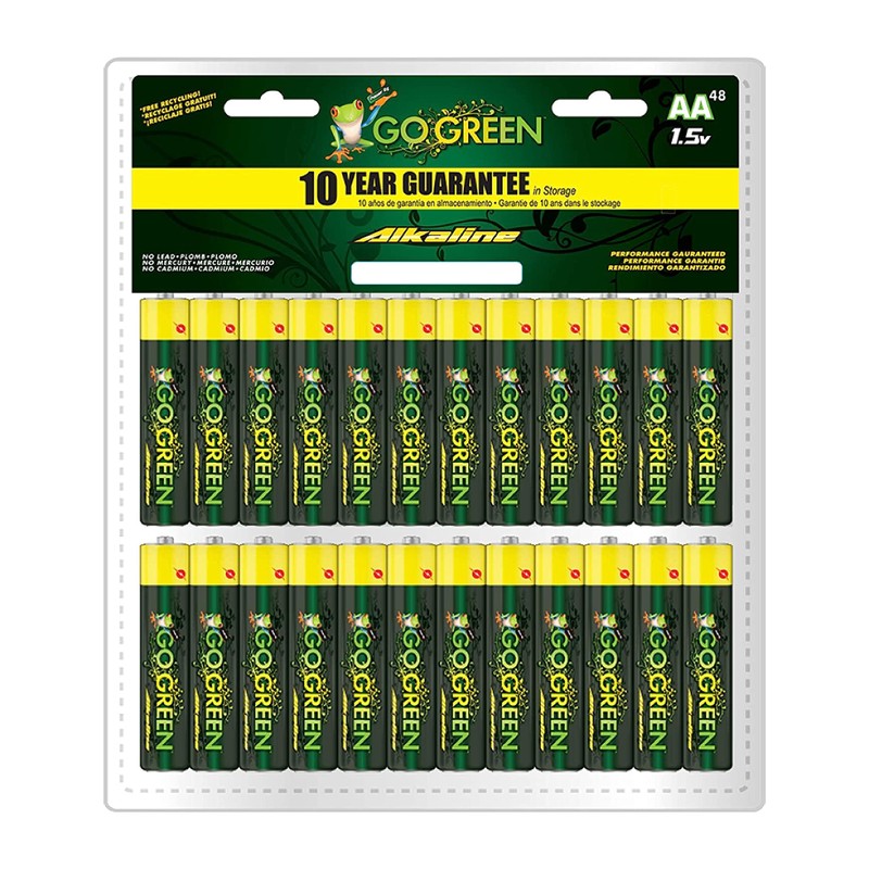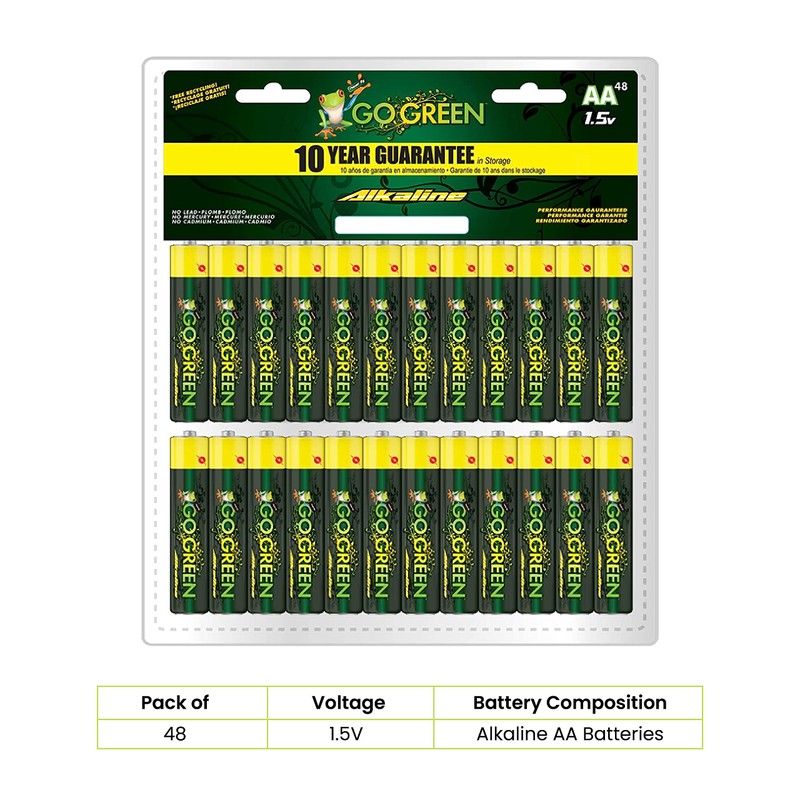 - Alkaline AA Batteries: GoGreen Power Alkaline AA batteries are an ideal choice for all your high-draining devices. This pack of 48 AA batteries are the perfect choice for eco-conscious customers.