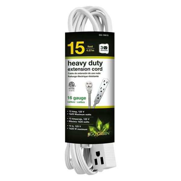 The GoGreen Power 15' 16/3 3 outlet extension cord is slim and reduces clutter. Quickly turns 1 outlets into 3 and is ideal for small home appliances and general household electronics.
