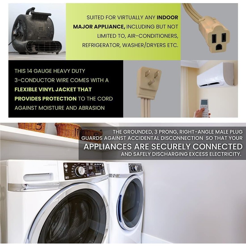 - Heavy Duty Power Extension: Suited for virtually any indoor appliance use, including air-conditioners, appliances, and fans, with a maximum of 15 amps, 1875 watts, 125v.
