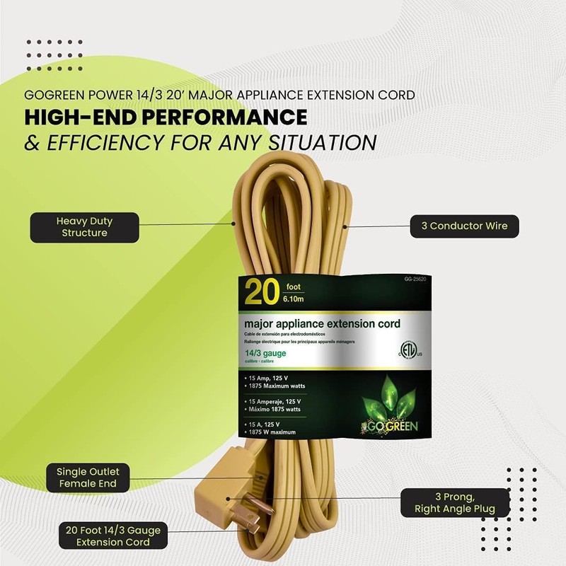 - Appliance Cord: The GoGreen Power 14/3 20' Appliance cords are the ideal, heavy duty cords for large appliances at home, such as washing machines, refrigerators and dryer machines. This kink-free cord from GoGreen fits the bill perfectly.