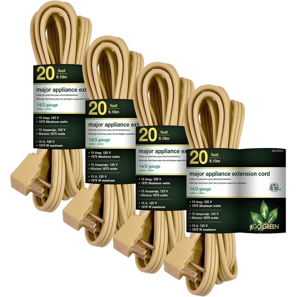 GoGreen Power Inc. (G-25620-4) 14/3 20' Appliance Extension Cord, Beige, 20ft, 4 Pack