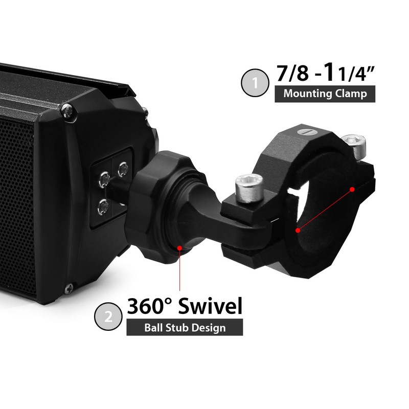 • Optional 24 White LEDs Strip. Turn On and Off with One Click! Dual Waterproof Motorcycle Stereo Speakers with Aluminum Stereo Main Unit. High Performance Power Amplifier Built-in. Speaker Clamp Universal fit 7/8 – 1 1/4" handlebar. Support Bluetooth Wireless connection up to 15 meters.