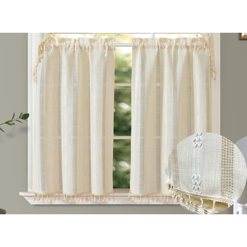GOHD Country Road Tiers Kitchen Curtains Boho Jacquard Stripe Tassel Bathroom Window Curtain 3 Size, 100% Polyester(36in,Beige)