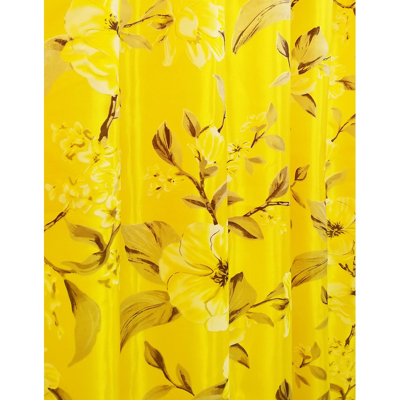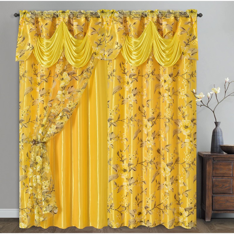 - This curtain is of popular YELLOW color. Thanks to its pattern and different fabrics of the double layer, it can show multi shade of the color so that it can easily match with most similar colors. The elegant floral pattern and royal fancy valance design makes it easy to match with most decoration styles too