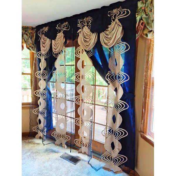- This curtain is of double layer. Front layer is clipped voile / voile jacquard with BIG VERTICAL spinning lines ( To me, it looks like melody lines ) design. Backing is taffeta fabric in deep color. One curtain rod is enough to have this nice curtain with both valance & backing. It also gives flexible way for you to either tie the front curtain or the backing or together to achieve different decoration effect and meet different needs for the light.