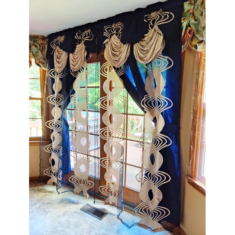 GOHD Spinning Singer. Clipped Voile. Voile Jacquard Window Curtain with Attached Fancy Valance and Taffeta Backing. 2pcs Set. Each pc 54 inch Wide x 90 inch Drop + 18 inch Valance. (Navy Blue)