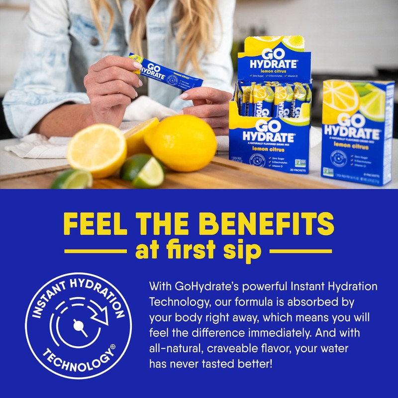 - Hydration On-the-Go: With convenient single-serve packets per box, GoHydrate makes it easy to stay hydrated wherever you arewhether you're traveling, at the gym, or during a busy day. Just mix with water and enjoy. Its powdered water-soluble formula ensures fast and easy absorption.