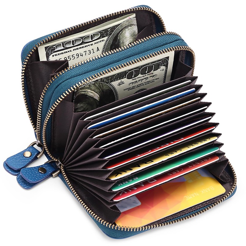- Large Storage Space and Zipper Protection: Double zipper compartments, one for cards or cash, one for coins or cash. 12 separate card slots, each card slot can hold 1 or 2 cards, 4 cash slots, can store coins or folded banknotes, and 1 ID window