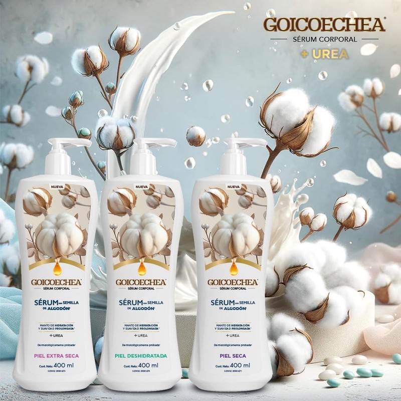 GOICOCHEA Crema Corporal para piel deshidratada con sérum de semilla de algodón. Hidratación y suavidad prolongada. Dermatológicamente probado. Botella con 400ml.