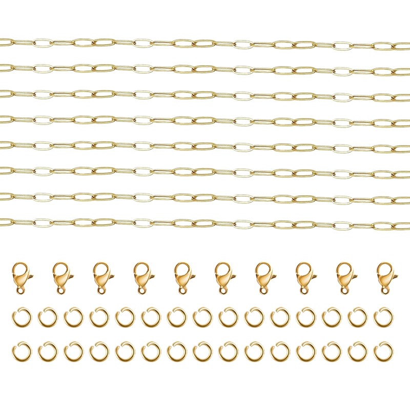 - 5 METERS JEWELRY MAKING CHAIN The package includes 5 meters stainless steel chain for jewelry making, 10 cancer clasps and 30 open jump rings. The flat staple link chain brings it a more classic style, with the additional jewellery making materials, it is convenient for you to create a personalised necklace, bracelet, anklet, earrings, keychain design, etc.