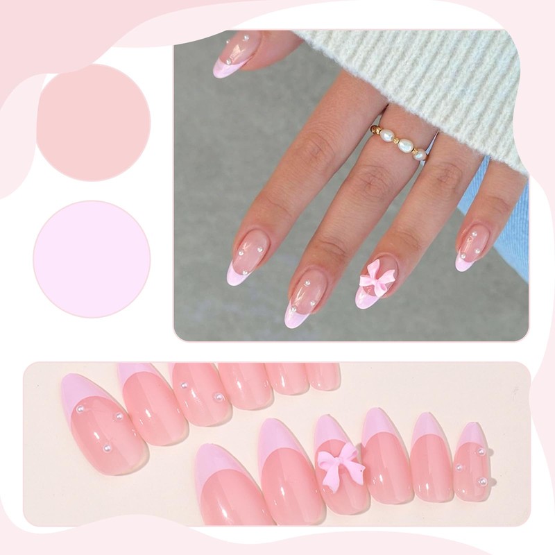 Goiern 24 Pcs French Tip Press on Nails Süßes Acryl Künstliche Nägel mit 3D-Schleife Perlmutt Nude Pink Vollständige Abdeckung False Nails Mandel Nail zum Aufkleben