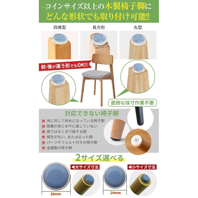 - No need to select sizes; Compatible with various shapes of legs: Wooden chair legs that are larger than coin size can be attached regardless of the shape. The multi-size design fits perfectly in square, rounded, rectangle, and even different shape chair legs. No need for complicated measurement procedures, and can accommodate different shaped chairs. It is 3.5 times stronger than the only double-sided tape