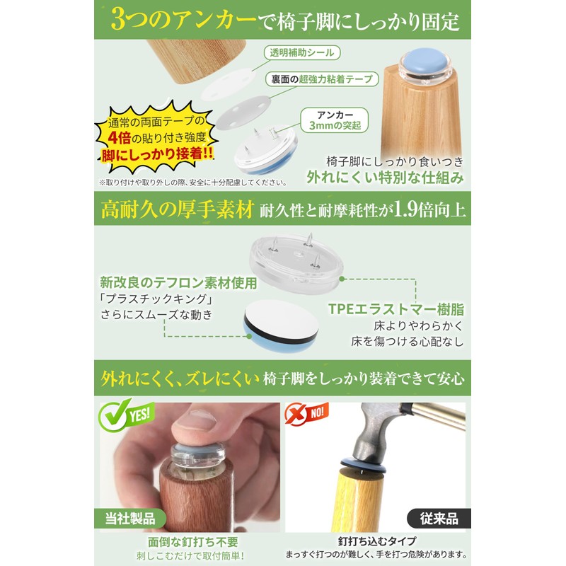 - (2025 Model Wooden Chair Leg Cover) Made with a newly improved Teflon material that is 4.3 times smoother than conventional rubber covers and 1.9 times more abrasion resistance. Soft TPE elastomer resin in contact with the floor will not hurt the floor. Prevents noise and scratches on the floor. For use with wooden leg chairs. Not suitable for chair legs: Chair legs that are angled against the floor, legs that do not touch horizontally with the floor, legs that contact with points, round or pointed legs, chair legs with parts or felt and metal chair legs