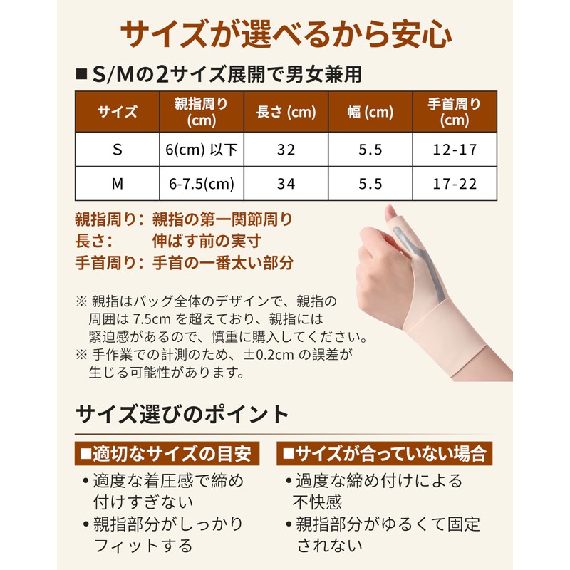 サイズ:S(親指周り6cm以下/手首周り12-17cm)、M(親指周り6-7.5cm以下/手首周り17-22cm)、『適度な着圧設計』です。