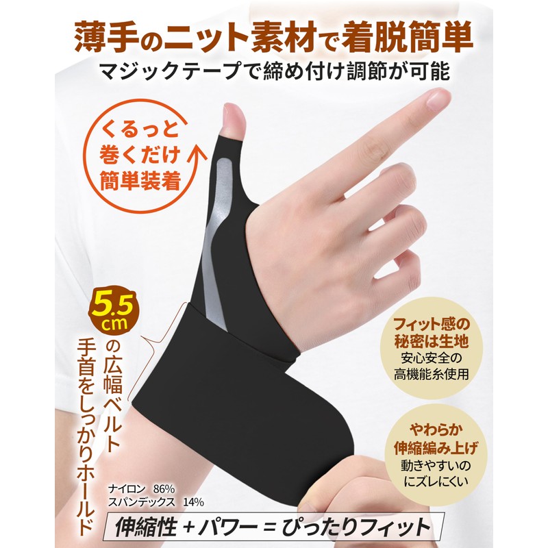 薄手生地のバンドを親指から手首に巻くだけの簡単装着で腱鞘をサポート。親指全体を包み込み、マジックテープで締め付け調節可能。