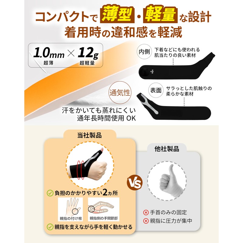 • ✅【 12gの軽量設計・薄手1.0mmなのに強力サポート 】 「邪魔にならない手首サポーター」をコンセプトに、厚さわずか1.0mm・軽量12gの薄手の設計で、服の袖が重なっても違和感少なく着用いただけます。親指形状に沿った立体カットと三層複合生地を採用。表面はサラッとした肌触り、内側は下着級の柔らか素材。伸縮性と通気性に優れ、夏場でも蒸れにくく、通年での長時間使用に最適です。