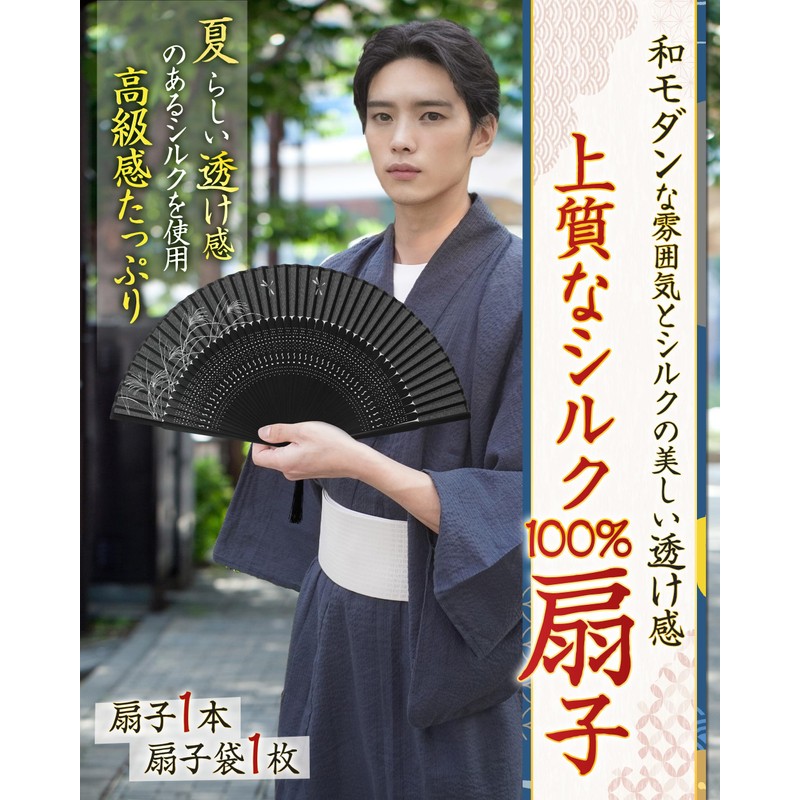 - (High Quality 100% Silk Fan) The fan surface is carefully laminated with thin silk fabric to create a delicate, three-dimensional beauty and a subtle sheerness. Features a luxurious sheen and smooth texture. Pure silk fabric is beautifully sheer under the light, giving a cool impression. By applying silk instead of paper, this "dapper short-cloth fan has a transparent and elegant finish, you can enjoy the luxury of high-quality silk. 4-piece set includes: Fan, tassel, fan bag (fan holder), gift box
