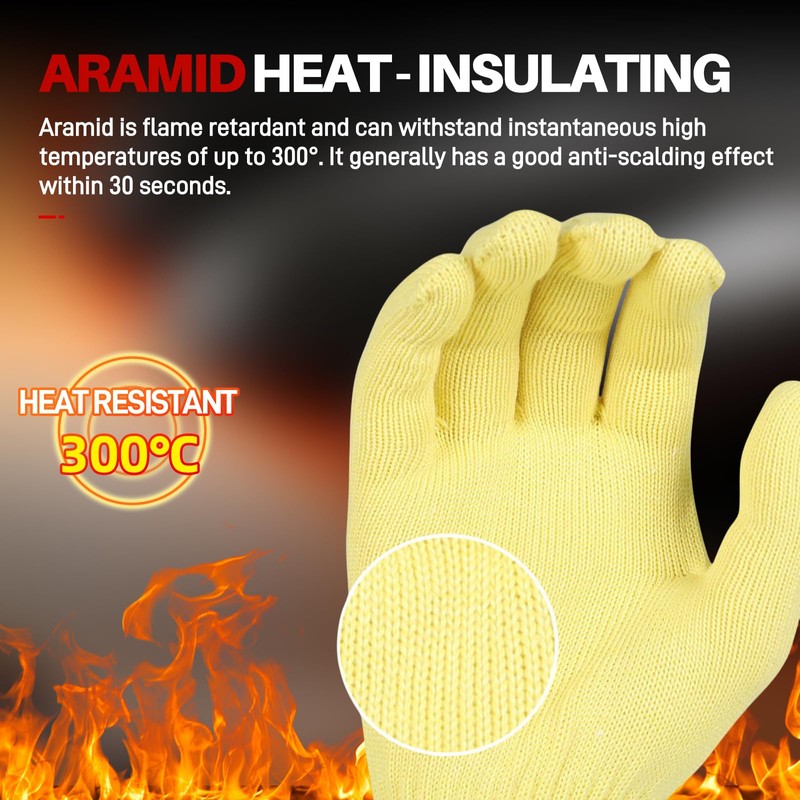 - ANSI Cut Level 4 Defense with Heat Shield:Aramid fiber construction meets ANSI/ISEA 105 Cut Level 4 certification, with heat resistance up to 450°F(232°C) for 15-second contact - critical for handling molten glass molds and steel forging dies