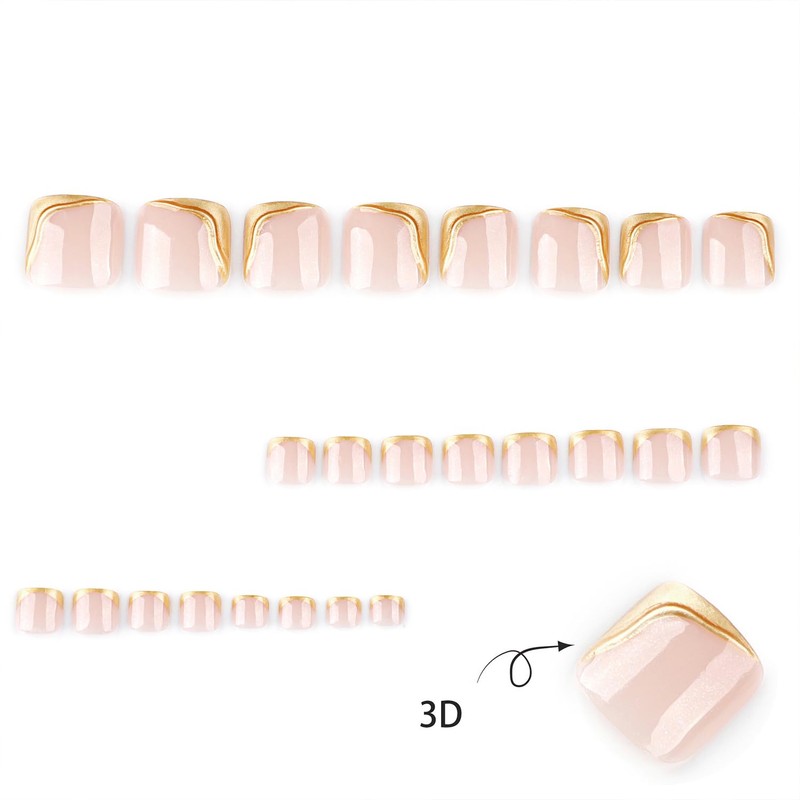24 Pcs 3D Gold French Tip Press on Toe Nails for Women Manicure Decorations