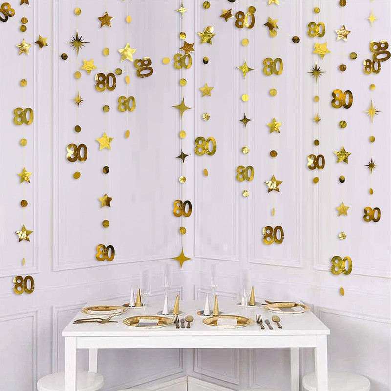 - Easy to install: Untangle the entire cord and hang it carefully to avoid twisting. Our star, circle, dot streamers with the number 80 can be cut to different lengths. Simply hang it on walls, windows, gift tables, dessert tables, fences, branches, in hallways and other indoor and outdoor areas